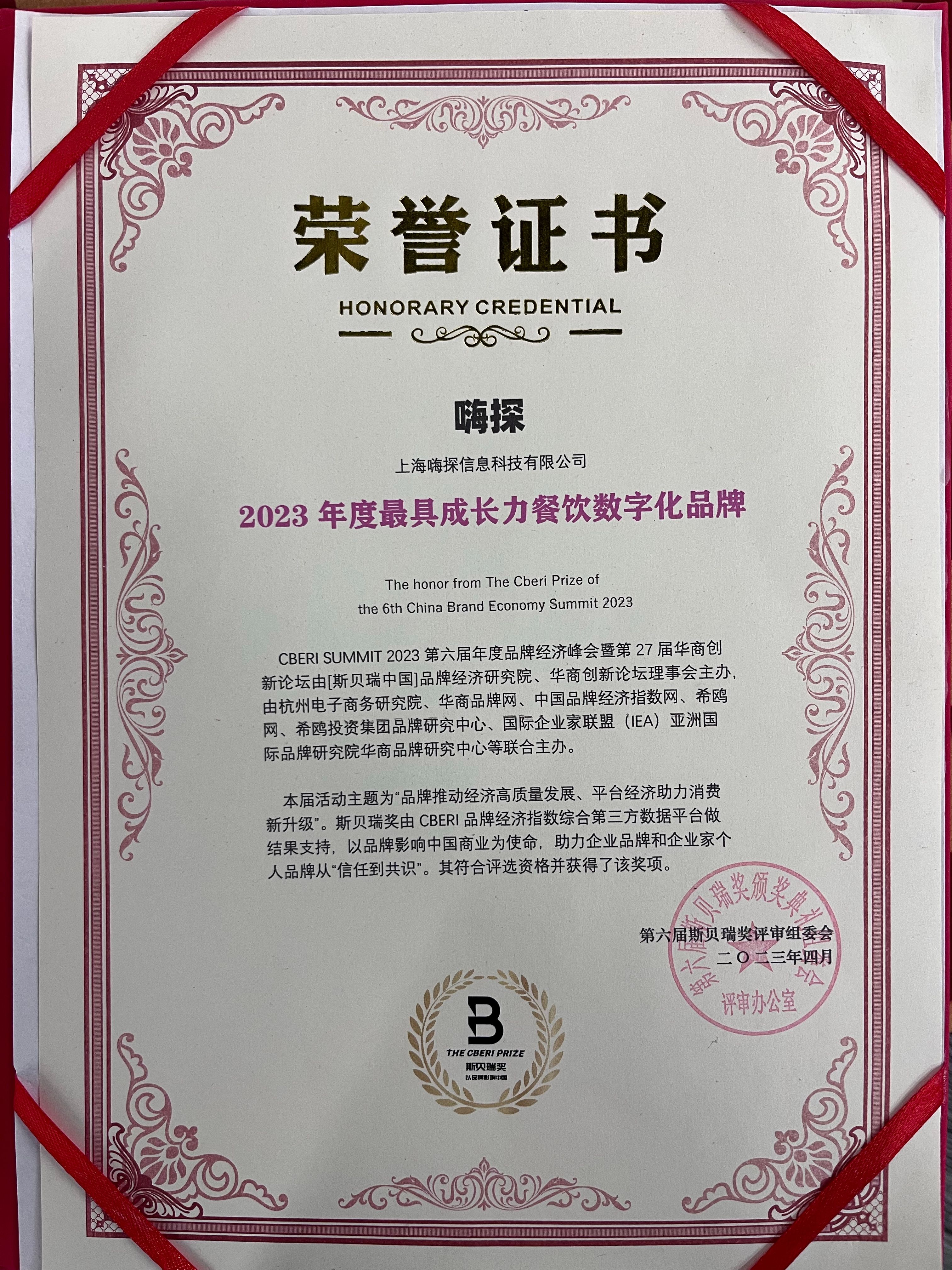 嗨探荣获2023年度最具成长力餐饮数字化品牌奖项